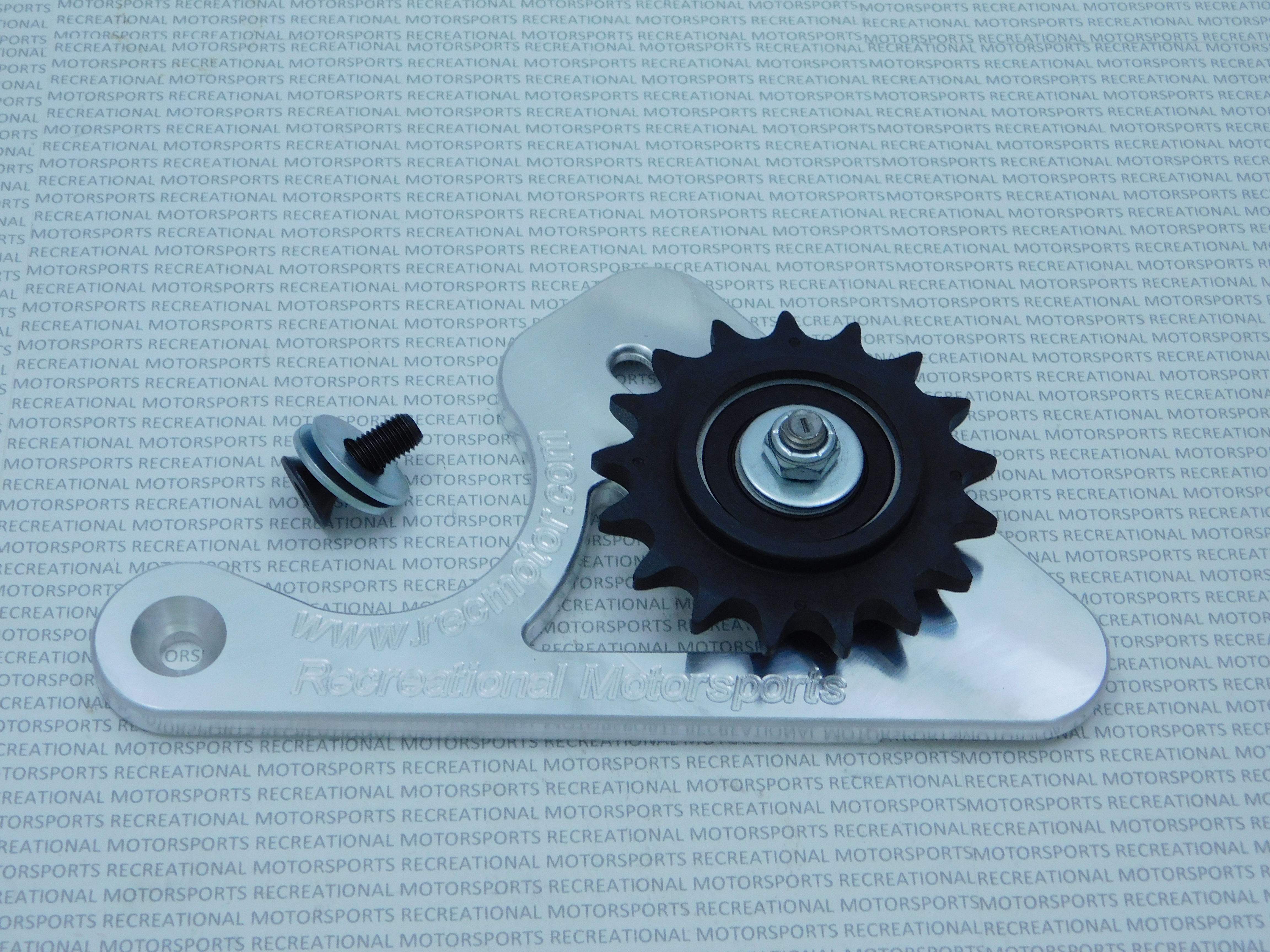 Recreational Motorsports has designed a new manual chain tensioner that is easy to install and elminates the factory spring loaded tensioners on the Arctic Cat Z120 and the Ski Doo MiniZ 120, this tensioner constantly keeps proper alignment and load on the drive chain under hard braking and acceleration which is very important when trying to reduce chain wear and clutch slippage. This is only for OEM 40 chains.