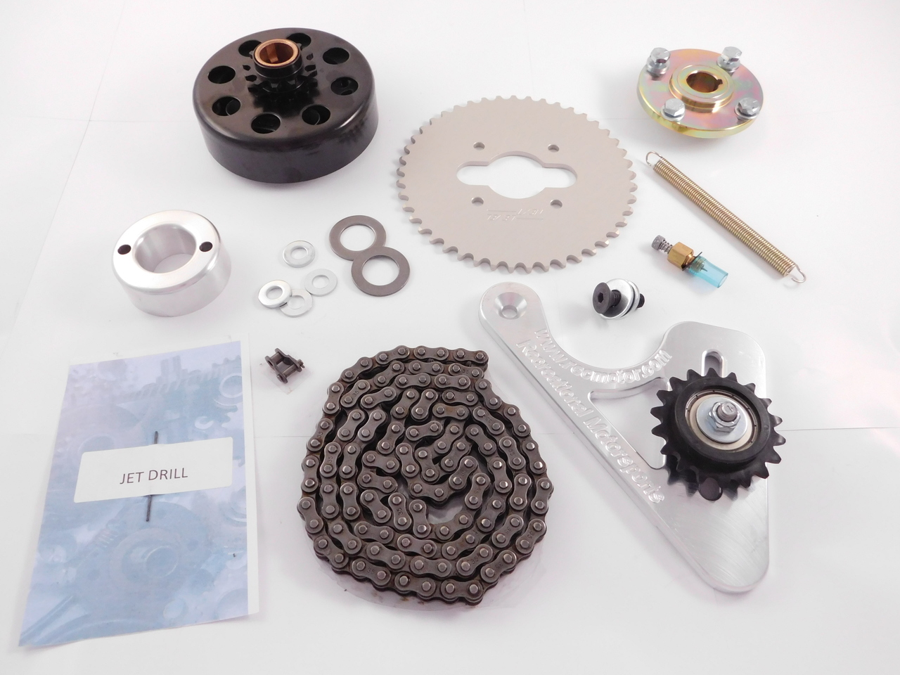This Speed Kit was named for the type of rider you have. If your child is AGGRESSIVE and you need to jump up to the next level in speed and power, we've created the AGGRESSOR SPEED KIT" for you. Not only will it allow your child to hit the speed they want, it is upgradable to many stages. Kit Includes: Power Intake Kit which comes with an adjustable main jet to correct the lean fuel condition that 120's have from the factory, a Velocity Stack to give the engine more air then the restrictive factory air box, and the correct Governor Spring for more RPM's, a Standard Upgrade Replacement Clutch with Sprocket, Quick Change Hub, #35 Rear Sprocket and # Chain and a Chain Tensioner. |