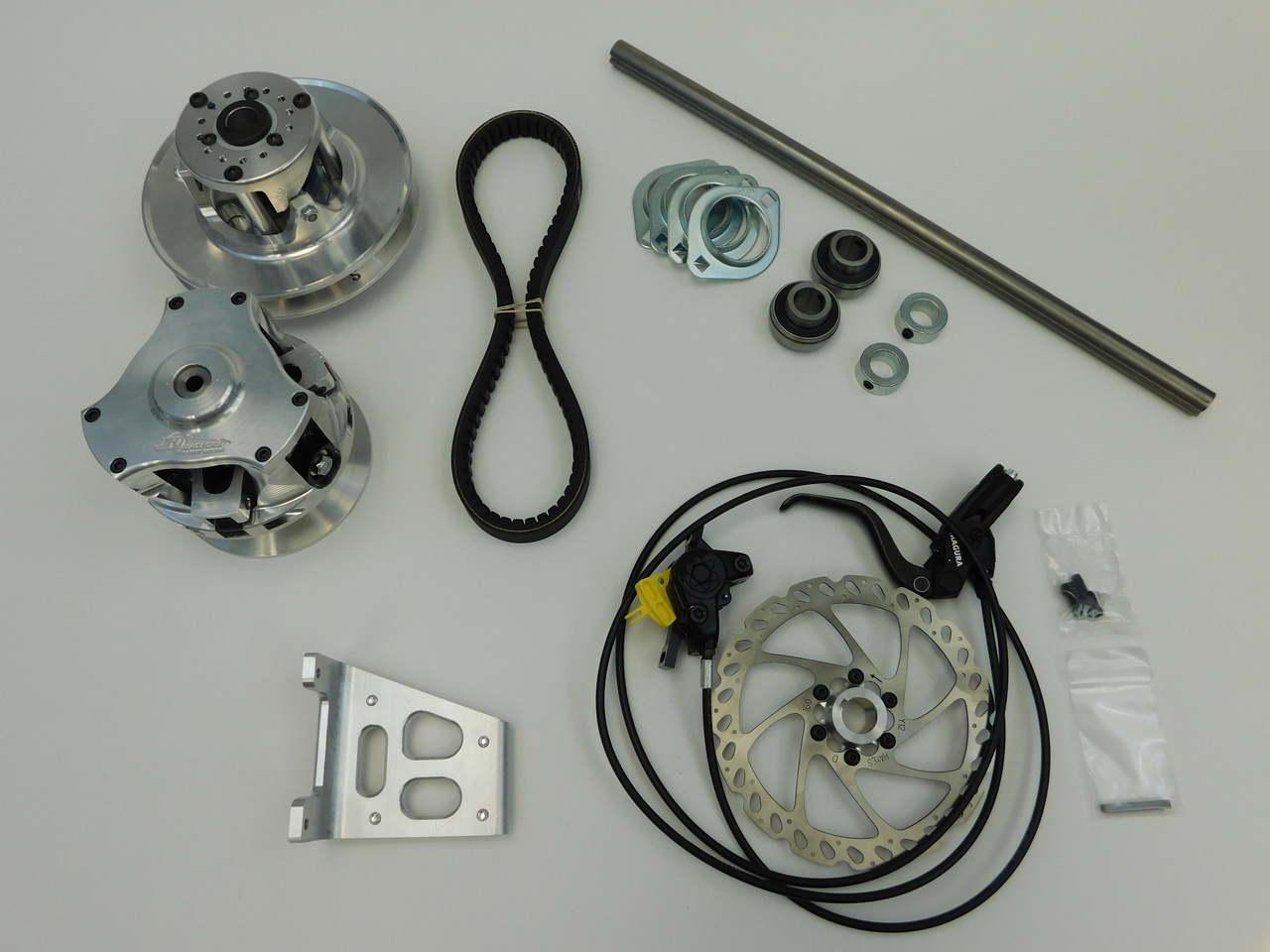 Since the start of the Drift Trike and Minibike craze builders have been getting more and more radical on their builds. We have set up a kit using our custom billet CVT belt drive clutches, along with a cool hydraulic disc brake set up. Jack shaft and bearings. All you will need is a sprocket for the jackshaft and we can help you determine what you need.